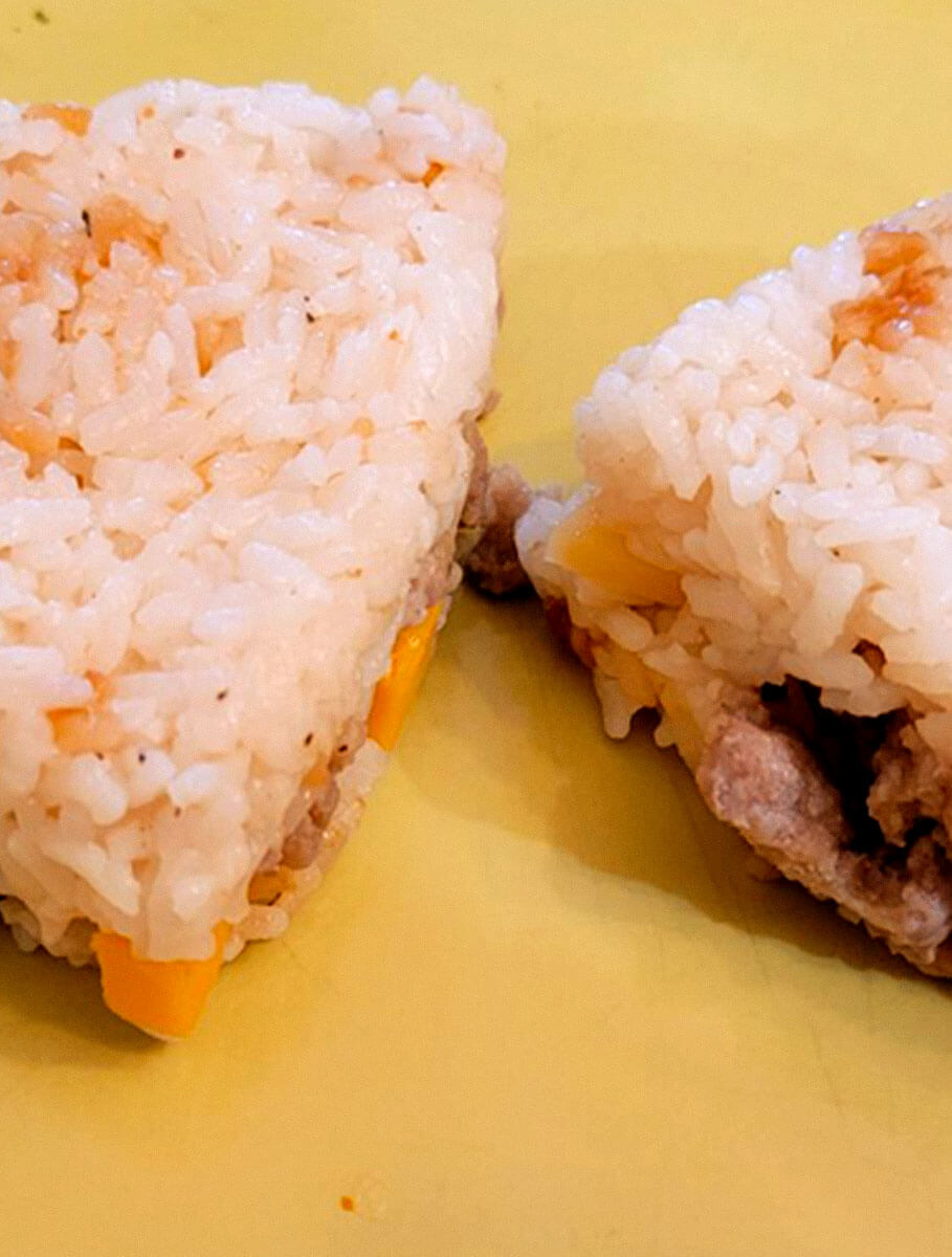 - Take a couple of Tablespoons of the rice and shape into a flat patty, like a tiny burger. Top with pork pieces and/or cheese of your choice. Cover the stuffing with additional rice, and shape into a small stuffed triangle shape. An onigiri mold makes this process easier to hold the shape better after everything is stuffed, but its not absolutely necessary.
