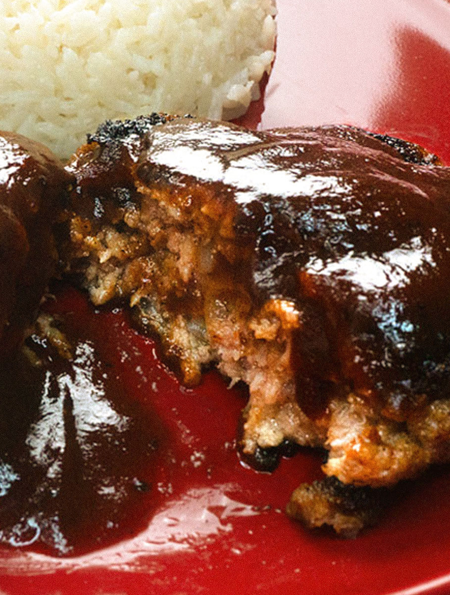 Asian hamberg steak on red plate with rice.